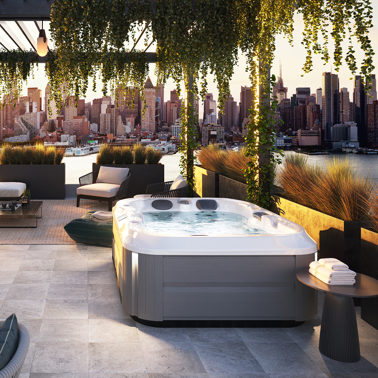 La nuova serie J-300 è caratterizzata da luci esterne angolari per avvicinarsi maggiormente alla collezione successiva. Luci bianche verticali che alleggeriscono visivamente la struttura della spa.