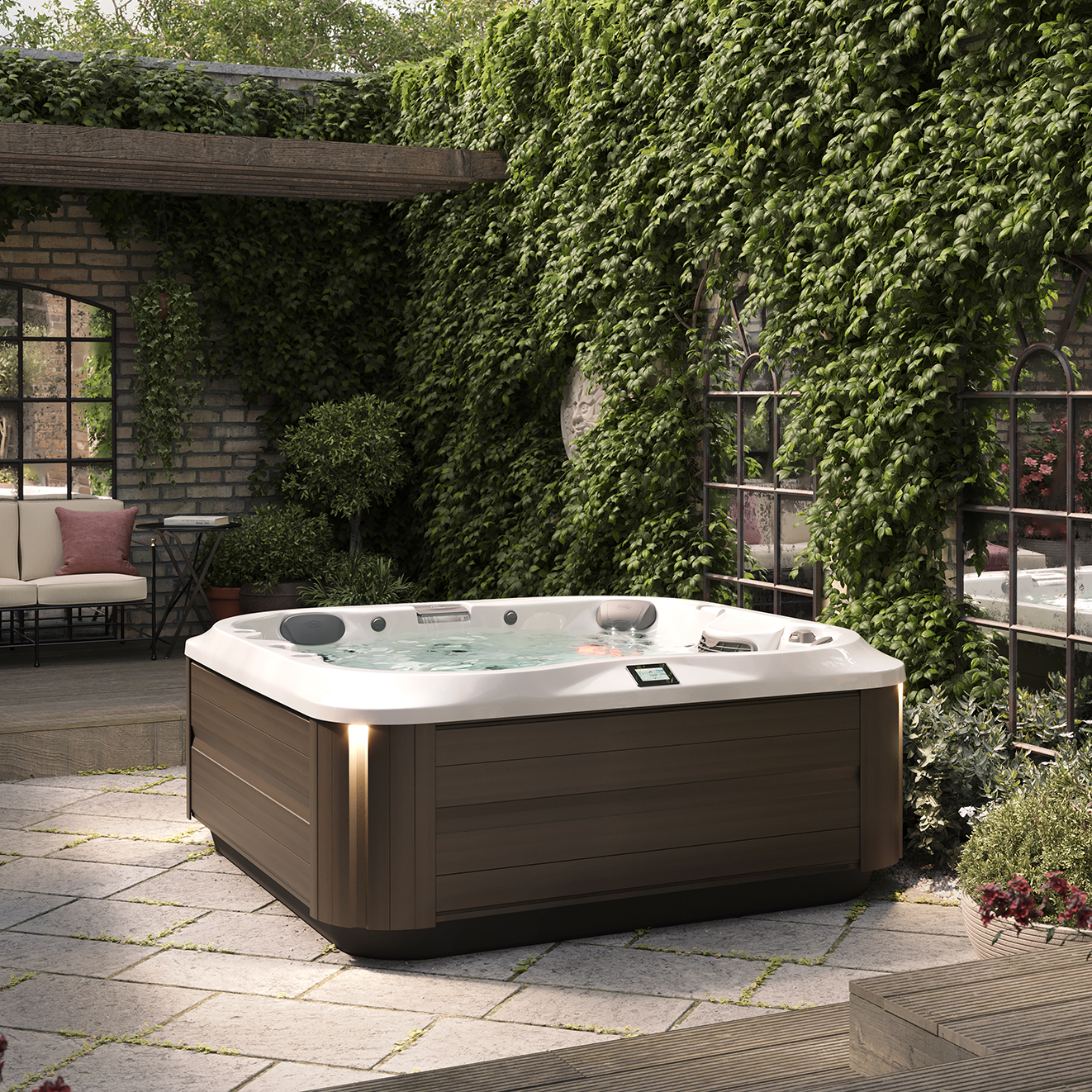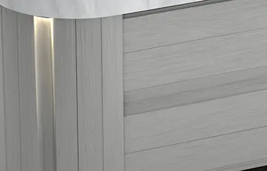 La nuova serie J-300 è caratterizzata da luci esterne angolari per avvicinarsi maggiormente alla collezione successiva. Luci bianche verticali che alleggeriscono visivamente la struttura della spa.