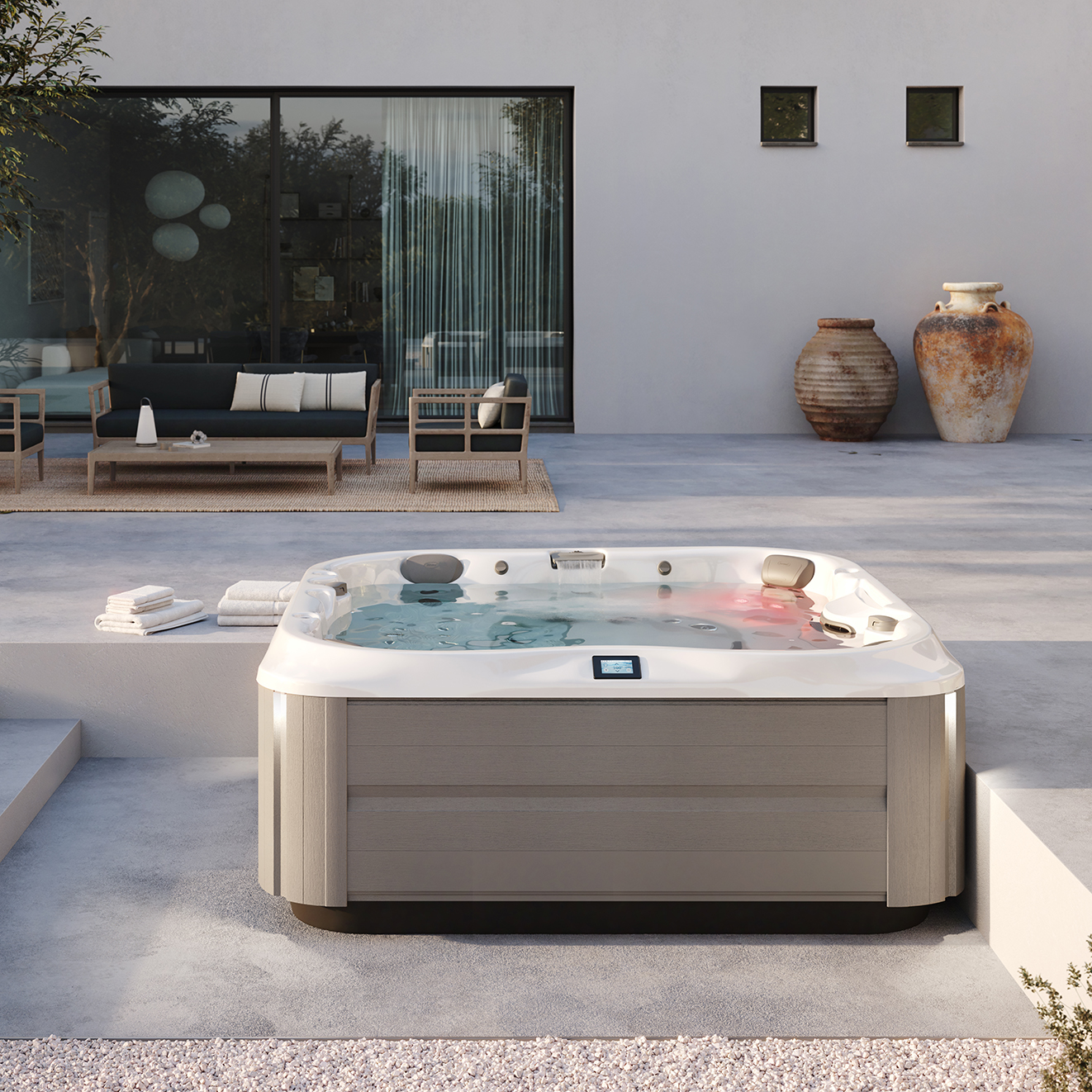 La nuova serie J-300 è caratterizzata da luci esterne angolari per avvicinarsi maggiormente alla collezione successiva. Luci bianche verticali che alleggeriscono visivamente la struttura della spa.