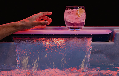 La bellissima cascata illuminata funge anche da tavolino bar per appoggiare i tuoi drink preferiti e rendere la tua sessione di idroterapia ancora più intensa e rilassante.