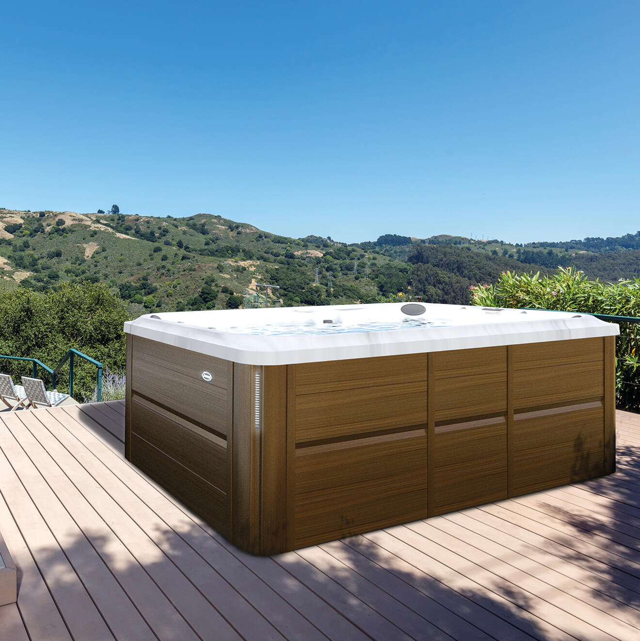 La nuova serie J-300 è caratterizzata da luci esterne angolari per avvicinarsi maggiormente alla collezione successiva. Luci bianche verticali che alleggeriscono visivamente la struttura della spa.