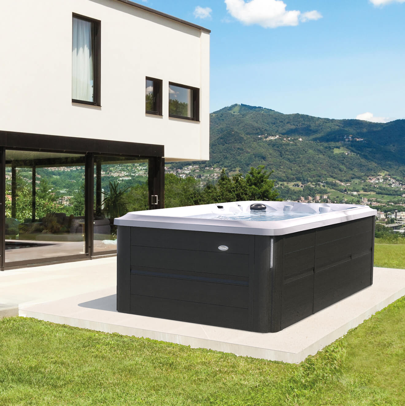 La nuova serie J-300 è caratterizzata da luci esterne angolari per avvicinarsi maggiormente alla collezione successiva. Luci bianche verticali che alleggeriscono visivamente la struttura della spa.