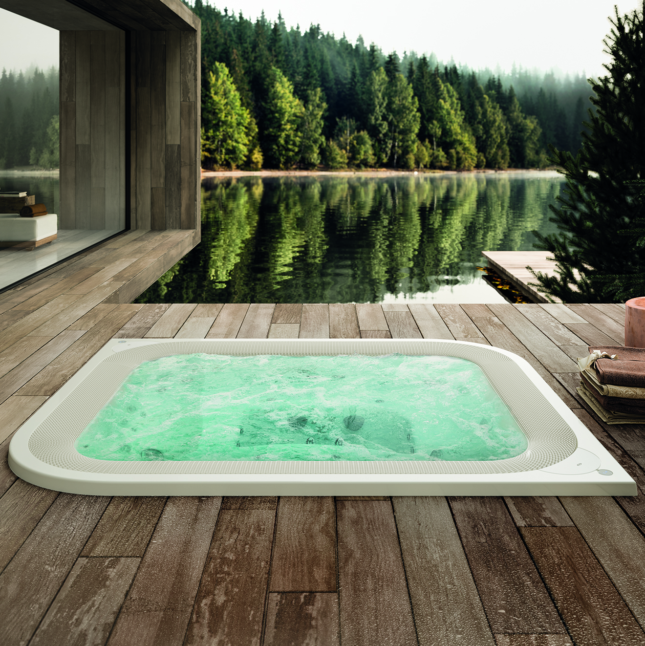 I modelli Virtus e Profile offrono uno spettacolare effetto dell’acqua infinity. Al momento dell’immersione, l’acqua in eccesso viene raccolta attraverso griglie perimetrali nei serbatoi di compensazioni integrati, per poi essere riversata nella spa mantenendo sempre il livello ideale.