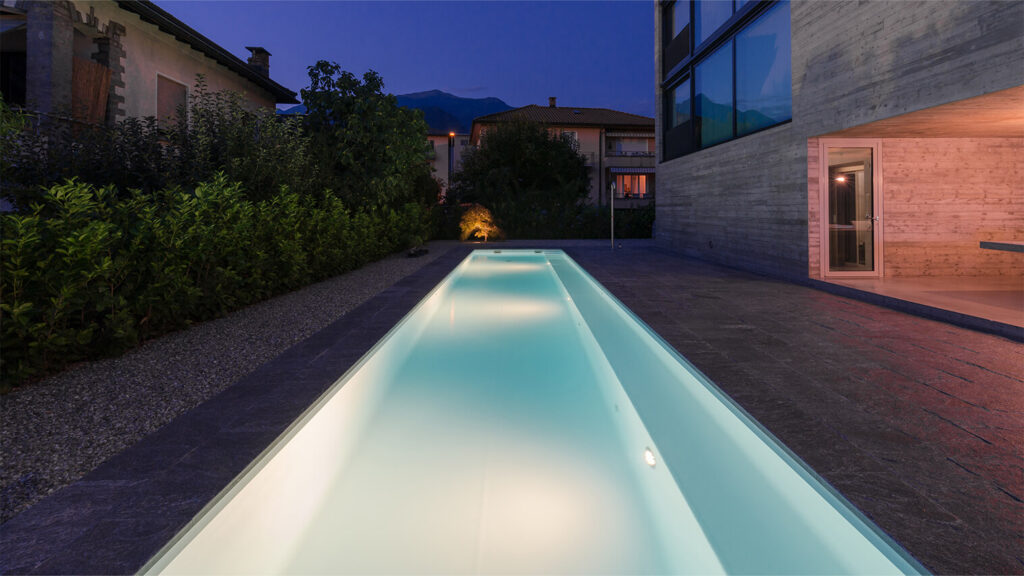 Una piscina adibita al nuoto avrà bisogno di qualche caratteristica in più: se lo spazio a disposizione lo permette puoi optare per una piscina lunga e stretta, se al contrario hai poco spazio in giardino c’è la possibilità di installare un impianto per il nuoto contro corrente.